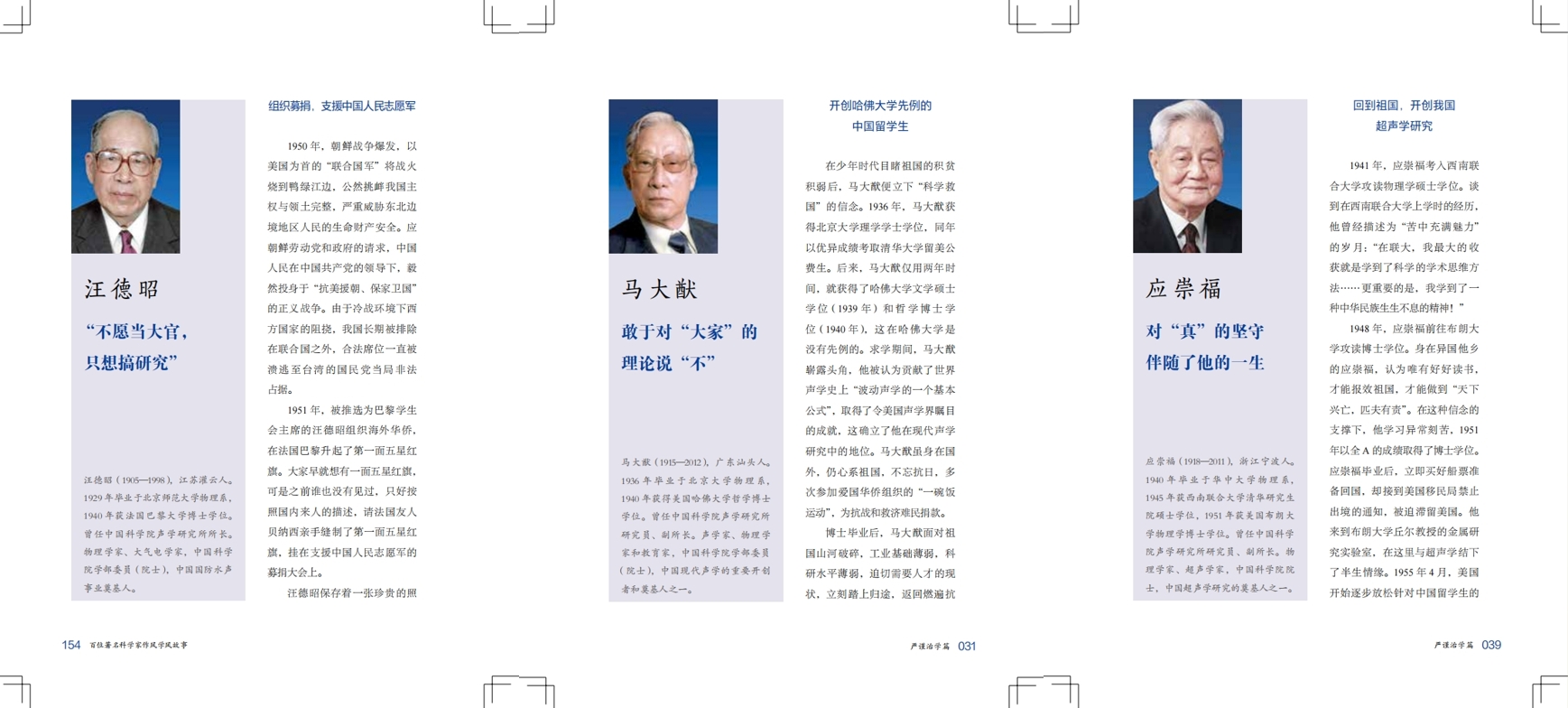 声学所汪德昭、马大猷、应崇福三位院士事迹入选该书,其中《汪德昭:“不愿当大官,只想搞研究”》入选“无私奉献”篇,《马大猷:敢于对“大家”的理论说“不”》《应崇福:对“真”的坚守伴随了他的一生》入选“严谨治学”篇。