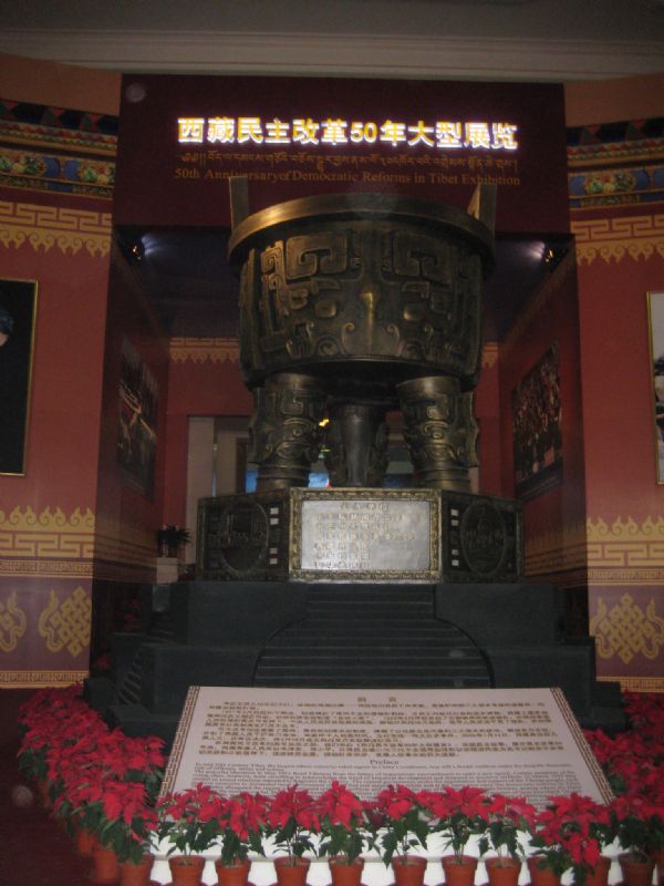 进入展厅,映入眼帘的便是一个巨大的象征和平、发展、昌盛的吉祥之物---鼎,其下的展牌上记录着展览的前言,讲述着位于祖国西南边陲的西藏,在民主改革开放前后翻天覆地的变化,一个官家、贵族和寺院三大领主专政的封建农奴社会到一个百万农奴站起来,当家做主人的民主西藏。