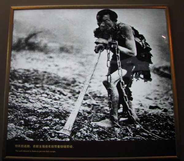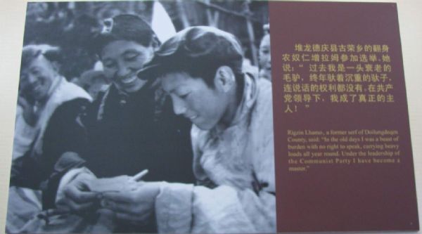 展览首先展示的是西藏的和平解放。在解放前,西藏施行的是落后的封建农奴制度,作为统治阶级的僧侣和领主过着糜烂的生活,而处于被剥削、被压迫地位的农奴不但要整日劳作,而且连最基本的温饱都得不到满足。更有甚者,统治阶级可以随意对农奴进行惩罚,甚至剥夺他们的生命。一组组触目惊心图片和迫害农奴的刑具告诉我们那是怎样一个血淋淋的时代,农奴过的是什么样的非人生活。