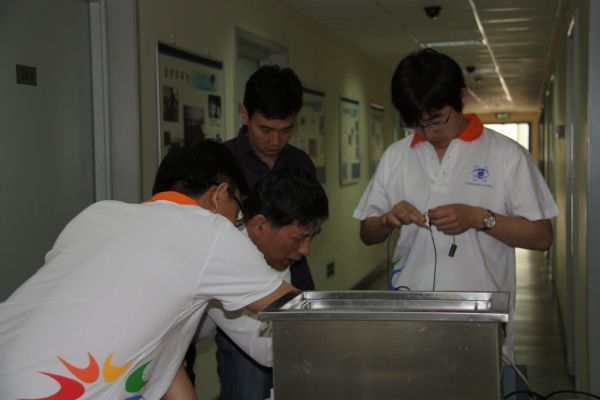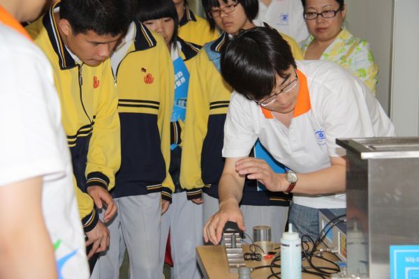 第一部分是实物展示。活动中实验室室共展示了四件与超声应用有关的实验装置,包括超声检测设备、超声清洗机、超声雾化器、超声乳化机。讲解员(车承轩、朱祖扬、安志武、李永安、王欣)根据参观者的知识背景,向大家深入浅出地介绍了各种设备的基本原理和应用领域,每一种设备的演示都吸引了众多参观者的好奇和赞赏,大家惊叹之余提出了很多有趣的见解和问题。在相互探讨和交流的过程中,参观者开阔了眼界,讲解员也拓宽了自己的科研思路。