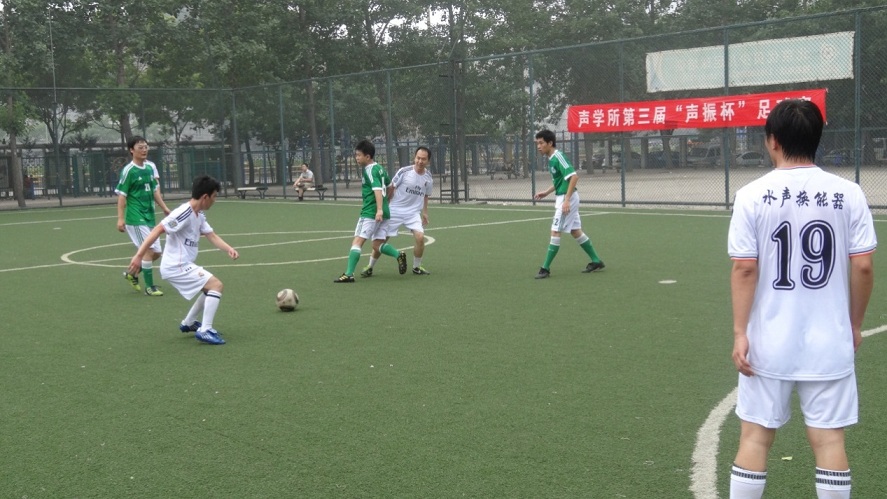 在中间场地上也进行着一场激烈的对抗,场上身披浅绿色战袍的是噪声与振动队,红色军团是医用声学队。刚一开场,卫冕冠军噪声队先声夺人,不到五分钟,就攻入一球。丢球后的医用声学队不急不躁,沉着冷静,多次突破到门前,却遗失大好机会,反而是经验丰富的噪声队越打越轻松,连连进球,但是医用声学也毫不气馁,获得多次角球,最终以2:6负于噪声与振动队。