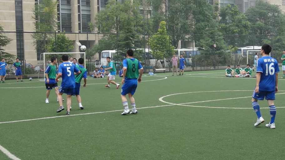身披蓝色战袍的是机关队,橙红色衣服的是声纳工程。刚一开场,两队很快进入状态,你来我往,好不激烈,但机关队凭借默契流畅的配合把声纳工程打了个措手不及,上半场以2:0领先。下半场易地再战,落后的声纳工程沉着应战,加强防守,在混乱中连取2分,最终双方战成2:2平。