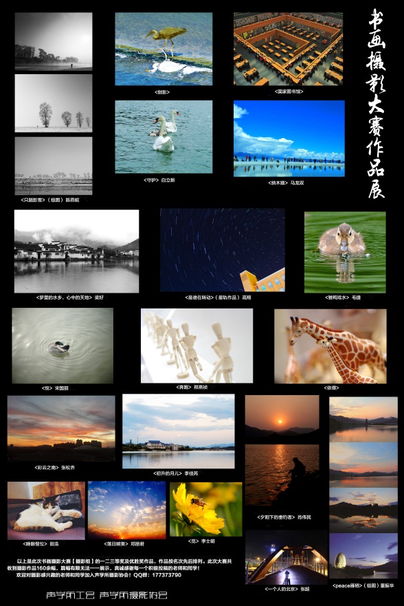 14级中科信利的陈燕妮的组图摄影作品《只影踏雪》,构图精简,主题突出,获得此次比赛摄影组的一等奖。优秀的摄影作品众多:超声技术中心的白立新的《守护》,形象记录了白天鹅的优雅温柔;噪声与振动实验室的梁好的《梦中的水乡,心中的天地》,黑白色调宛如一幅水墨画,将徽派建筑的简约婉转表达诠释的很好;超声技术中心高翔的星轨作品《是谁在转动》,星轨作品前期和后期的拍摄难度都很大,虽然作品构图不甚完美,但依旧是不可多得的作品。海洋技术中心马龙双的《纳木措》,展现了虔诚的朝圣者到圣湖纳木措净化洗礼的画面。