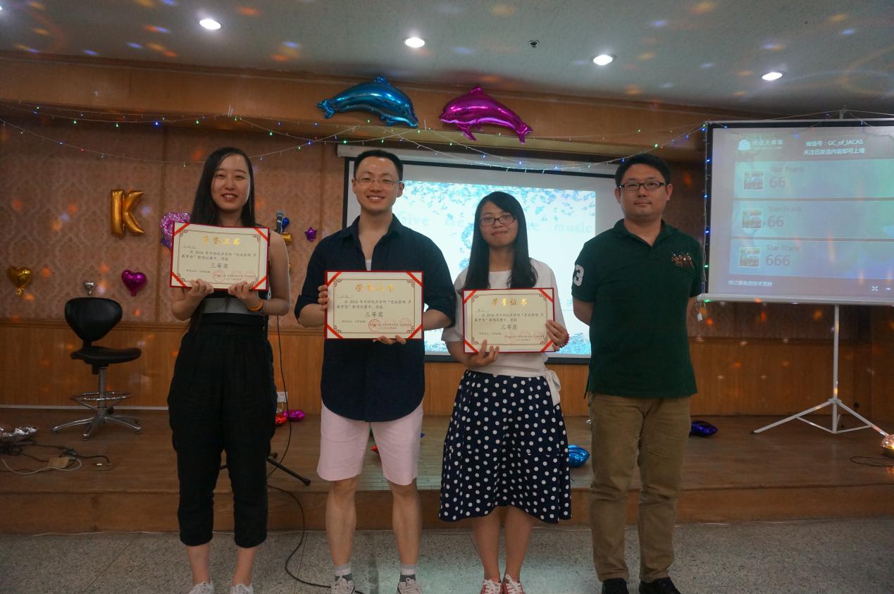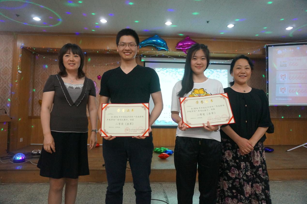 最终,根据评委及大众评委的评分,廖怡、耿晓琳及战鸽获得三等奖,李瑨瑶与张燕凯获得二等奖,比赛的最终冠军由中科院噪声与振动重点实验室的旷玮夺得,此次的声学所歌唱比赛也在颁奖仪式中落下帷幕。