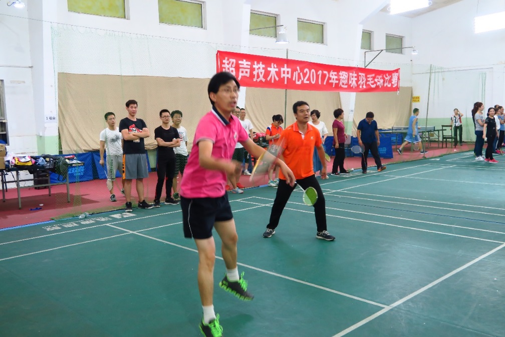 比赛还未开始,羽毛球馆已呈现一片欢乐沸腾的景象,选手们个个舒展筋骨,做足赛前热身运动,在超声技术中心分工会主席黄宝华老师的组织下,超声技术中心主任王秀明研究员为大家加油鼓劲,超声技术中心副主任张碧星研究员为本次羽毛球赛开球,林伟军和陈德华组成了此次比赛年龄最大的男双组合,一上场就遇冠军组合,比赛打得难解难分。