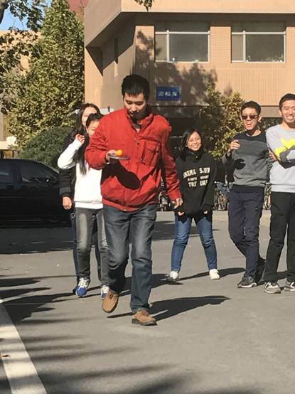最后一场比赛是最为紧张刺激的托球跑接力赛,因为这是一项团体项目,每个参赛运动员都十分认真专注。运动员们用乒乓球拍托着乒乓球快速跑动,乒乓球在球拍上每一次转动都会引起观众们一声声惊呼,每一位运动员成功返回都会引来一阵阵喝彩。比赛刚一开始,网络新媒体的宋磊老师就迫不及待地托着球往前跑,但是由于比赛当天风比较大,乒乓球一不小心就掉了,宋磊侧向一个箭步俯身捡球,再立刻回到丢球的地方出发,这套动作一气呵成干净利落,他凭借敏锐的身手竟然也不落后别人多少。要说速度最快还是经常健身的脱立恒老师,他依靠自己良好的平衡能力和肌肉控制力,平稳快速地完成了自己这一段,为比赛奠定了优势局面。