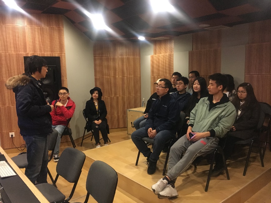 在宽敞明亮的录音棚里,同学们了解了关于录音棚的方方面面,比如:装修材料的声学特性与标称不符时,如何实现期望的混响效果;监听室搭建无反射区时遇到的种种难题。很多声学专业的同学表示这是第一次亲耳体验到书本上讲的“混响时间”“混响半径”等概念,兴奋不已。