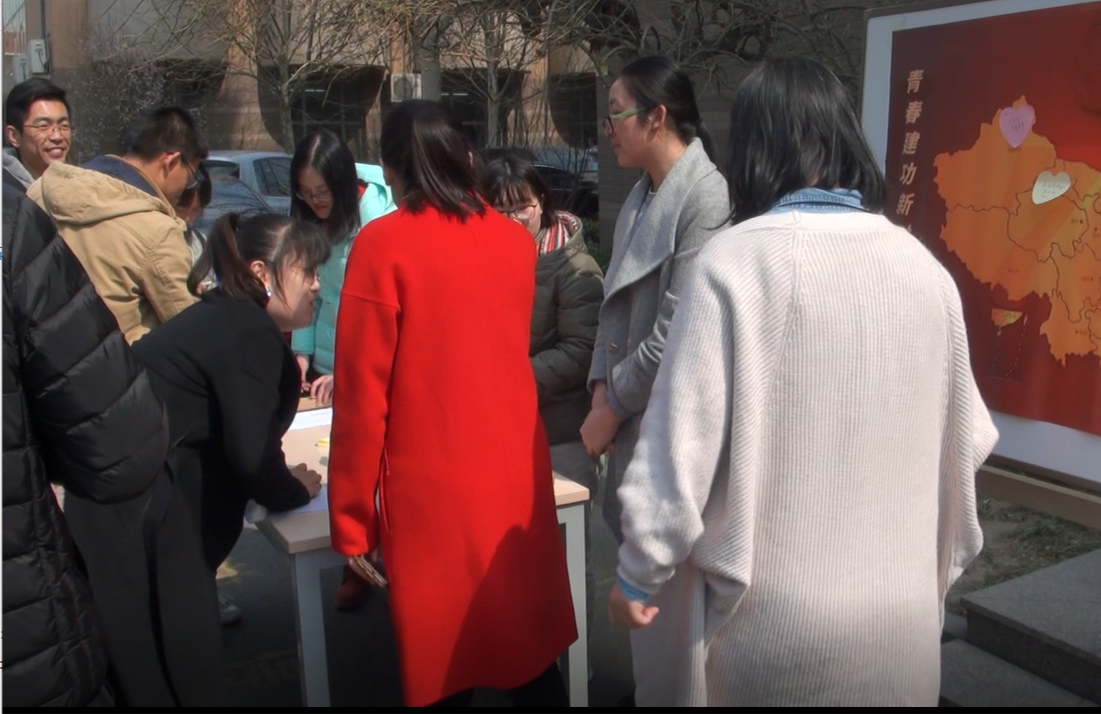 志愿者们准备了彩色的心愿签和笔,精心设计了印有中国地图图案的心愿墙,并且在现场竖起了团旗。路过的职工和研究生们纷纷在心愿签写下自己的愿望,将其贴到心愿墙上展示。