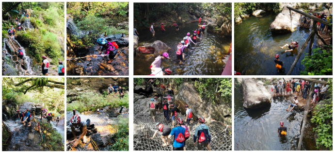 “踏瀑戏水”拓展活动设置在呀诺达雨林纵深1.2公里、落差200米的梦幻谷中,急流、怪石、瀑布、巨树等构成了一个令人热血沸腾、几欲征服的神秘地带。大家穿上草鞋,戴上头盔,在教练的带领下溯溪而上。一路上,队员们乘飞索穿越深潭,踩浮桥渡险,爬绳网,过绳桥,徒手攀绳踏瀑布,“过五关斩六将”,在与水石的亲密接触中,体验飞瀑戏水的刺激和乐趣。欢声笑语荡漾在潺潺溪流中,加油鼓劲回响在茂密山林间。活动中,女生不畏困难,展现巾帼风采,男生活力十足、互帮互助,展现团队协作精神。