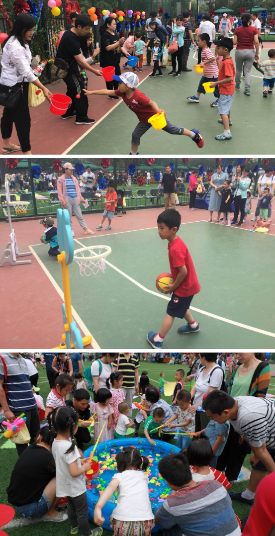 根据孩子们不同的年龄阶段和活动特点,本次亲子活动划分为0-3岁区域、4-6岁区域、7-12岁区域,设计了丰富多彩的节目和游戏,运动类的有快乐溜溜布、东南西北跑、车轮滚滚、快乐圈圈、趣味投篮、巧接彩珠、抖甩乒乓球、背夹球、快乐跳绳等;休闲类的如儿童钓鱼、积木、动物纸杯画、空气黏土等。游戏过程中,孩子和家长的欢声笑语不绝于耳。