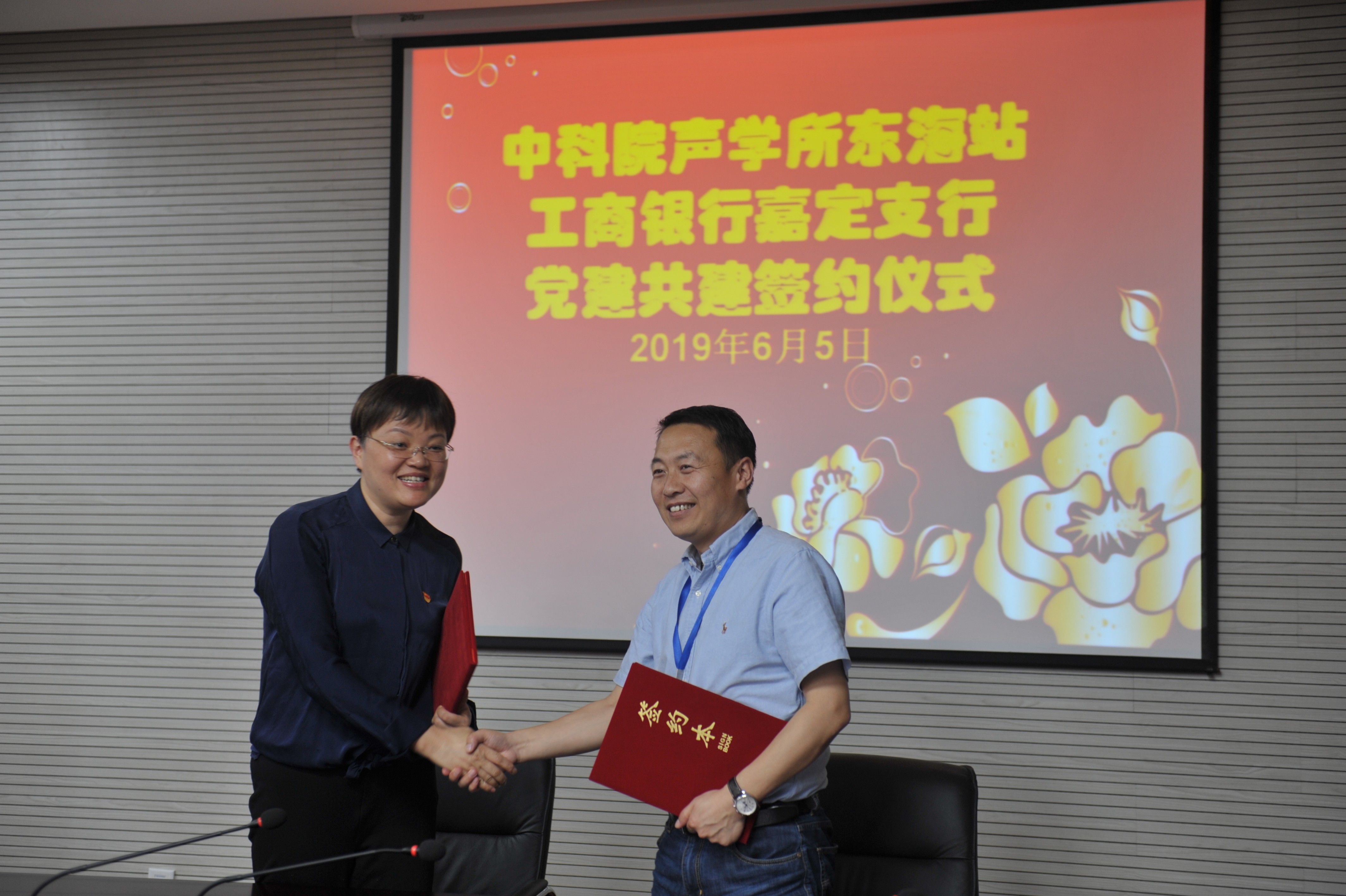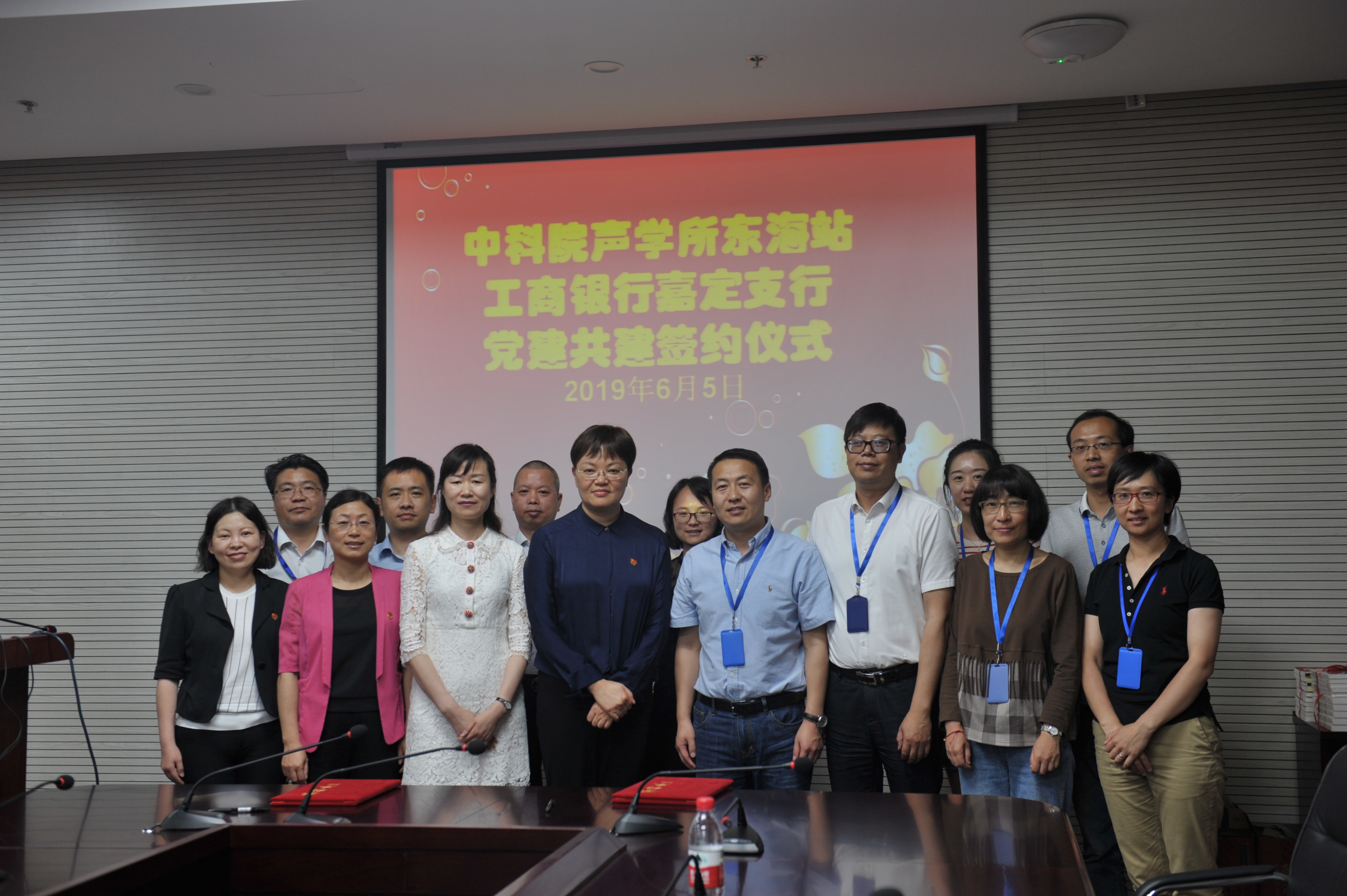 为贯彻落实党的十九大精神,推进“不忘初心牢记使命”主题教育,进一步创新党建形式和内容,中科院声学所东海站党委与工商银行嘉定支行党总支于2019年6月5日进行了结对共建签约仪式。东海站全体党政领导班子,工商银行嘉定支行行长、总支书记曹枫等领导出席了签约仪式。参加共建仪式的还有东海站在职党支部委员和工商银行嘉定支行各支行的党员干部。