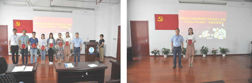 2019年,中国共产党成立98周年,也是中华人民共和国成立70周年。7月1日,东海站党委组织纪念建党98周年党员表彰大会暨“不忘初心牢记使命”专题党课报告,全体在职党员、退休党员代表和研究生党员参加了会议。大会由党委副书记、纪委书记丁培主持。