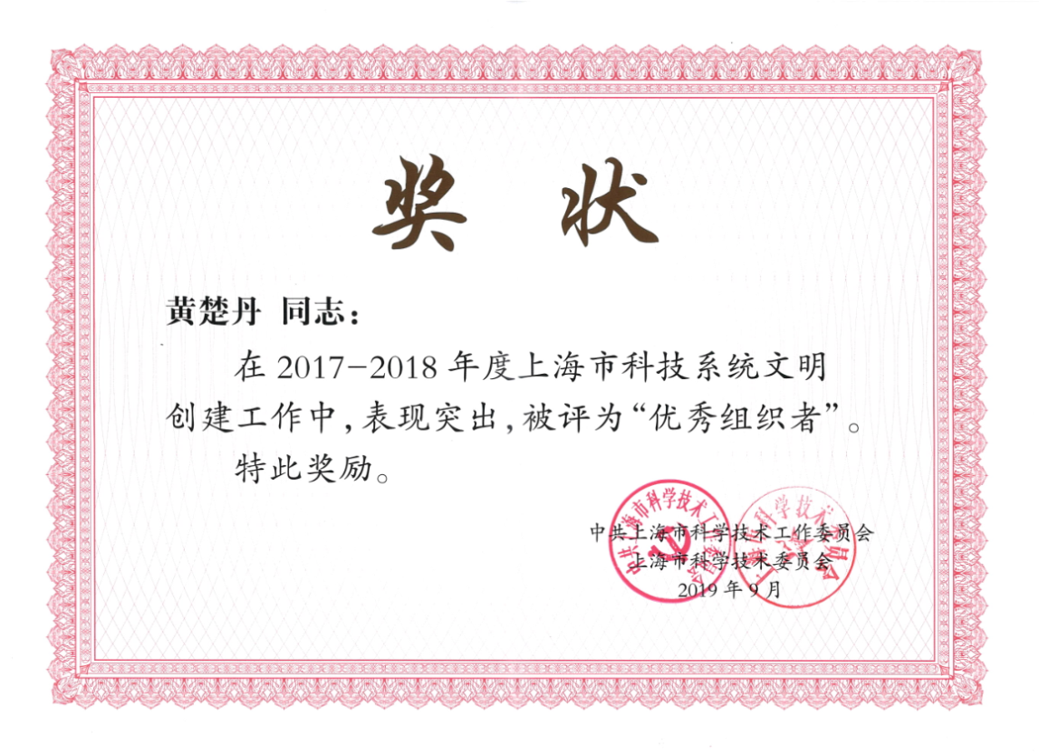 2019年9月24日下午,为喜迎新中国成立70华诞,上海市系统在科学会堂举行 “礼赞新中国,科创争先锋”庆祝中华人民共和国成立70周年主题交流会。会上中国科学院声学研究所东海研究站作为新晋上海市文明单位被授予上海市“文明单位”奖牌。东海研究站第三党支部被授予上海市科技系统“先进基层党组织”称号,景永刚同志被授予上海市科技系统“优秀共产党员” 称号,黄楚丹同志被授予2017-2018年度上海市科技系统文明创建“优秀组织者”称号。