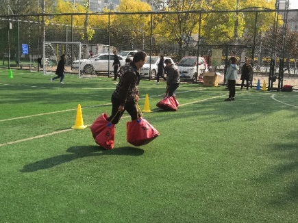 今年新加的团队协作项目是众星捧月,需要6-10人手持道具,将球放在道具上,众人合力将球颠起,60秒内,颠球次数多者获胜。大家需要根据球的落地点和弹起高度确定哪个选手多用力哪个选手少用力,从而保证球更加平稳地弹起。