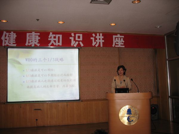 为了帮助广大职工提高健康保健意识,了解更多的健康保健知识,增强体质,提高健康水平,2007年9月14日上午,人事教育处举办了健康知识讲座,中国抗癌协会科普宣传部副部长、肿瘤心理学专业委员会专家委员宗倩老师详细介绍了如何吃出健康,远离癌症,科学防治糖尿病、预防脑中风等4个方面问题。