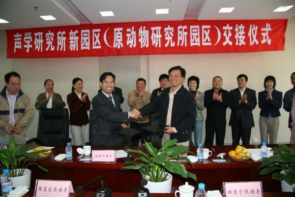 交接仪式上,孔繁文局长、李婷副院长和王志刚副局长先后发表了热情洋溢的讲话,几位领导首先向动物所、声学所表示祝贺,对两所园区交接工作的平稳、高效给予了高度的评价,并预祝两所今后在各自新园区良好的工作环境下取得更大地进步。张知彬所长、田静所长分别代表各自单位发了言,他们首先感谢院领导、基建局及分院对动物所、声学所园区建设工作的大力支持,感谢对方单位在园区交接工作中给予的充分理解和积极配合,希望两所今后继续保持邻里间般的良好友谊。随后,两位所长代表双方单位签署了《动物所原中关村园区(北四环西路25号)移交至声学所相关事项备忘录》,这标志着声学所正式拥有了自己的新园区。之后,在张知彬所长、陈浩副所长的陪同下,田静所长等随行人员参观了动物所新园区。