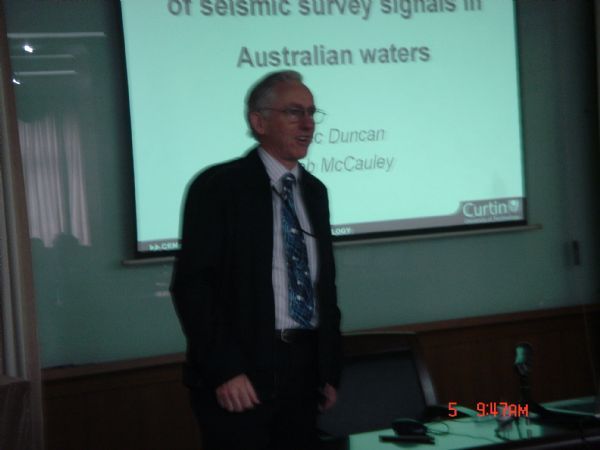 2007年11月5日,澳大利亚Curtin University of Techonlogy 的Penrose教授、Gavrilov教授和Duncan博士到中国科学院声学研究所东海研究站进行了学术交流。交流会上,Duncan博士和Gavrilov教授分别作了关于Modelling and measurement of seismic survey signals in Austraian waters和The current role of global(long-range) acoustics in oceanographic,climatological and geophysical studies的学术报告。
