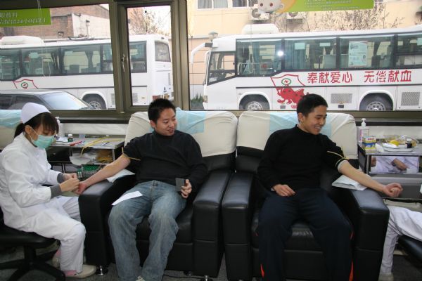 大家都表示希望以后再次参加献血活动,为社会多做贡献。 这些同志的勇敢和无私奉献的精神令在场的工作人员非常感动,也再一次展现了我所青年职工与研究生良好的精神风貌,为进一步倡导社会主义荣辱观,构建和谐社会,践行“十七大”精神作出了很好的表率。 此次献血活动受到了所领导的高度重视,办公室为此倾注了大量的心血,在整个献血过程中至始至终一直关心着每个同学的身体状况,同时在组织工作方面做了精心的安排,为同学们准备好了红糖水以及丰富的营养餐等,使大家在奉献的同时也感受到了组织的温暖。 爱是无私的奉献,几百毫升血对一个身体健康的人微不足道,可对于重症缠身的病人来说,它就意味着生命。我们相信,在我们献出爱心、帮助了陌生人的同时,自己的心灵也得到了一次洗礼和升华。让我们向这些勇士们学习,为社会献出一份爱心,献出一份真情,让我们的青春在奉献中闪光! 常宝军、时磊同志光荣献血
