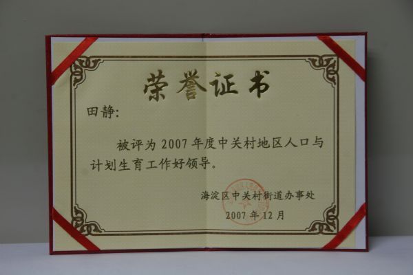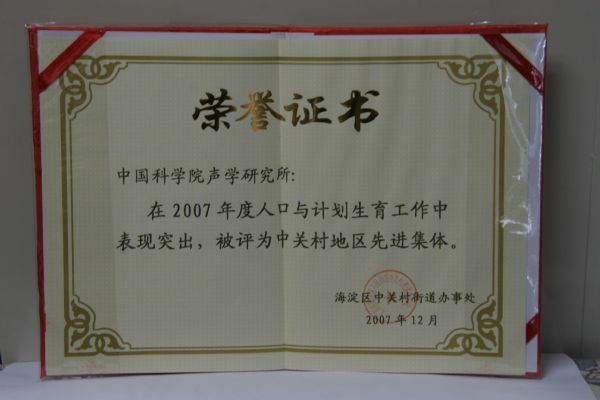 声学所长期以来高度重视人口与计划生育工作。田静所长坚决贯彻“党政一把手亲自抓、负总责”的原则,切实做到责任、措施、投入三到位。将计划生育工作同其他各项业务工作一同布置、一同考核。在田静所长及所领导班子的领导下,在所计划生育工作人员的不懈努力下,2007年,完成了计划生育管理目标。计划生育率100%;晚育率100%;独生子女领证率100%;无超计划生育率100%。