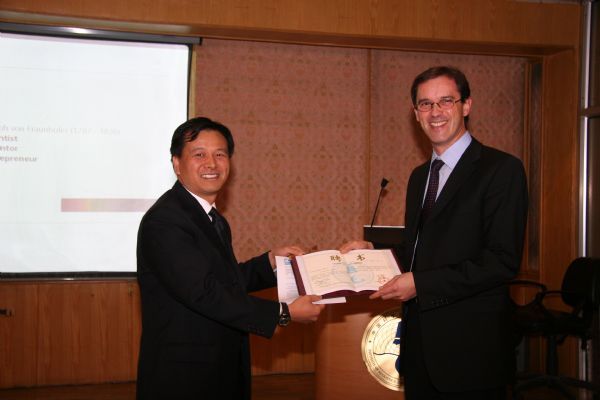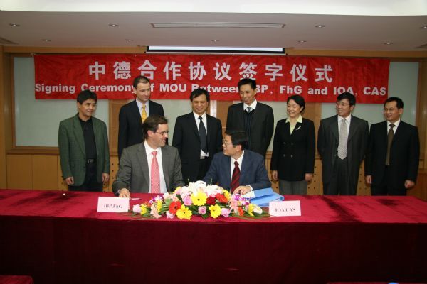 德国弗劳恩霍夫应用研究促进协会是德国同时也是欧洲最大的应用科学研究机构,重点在工程科学领域开展应用研究工作。其下属建筑物理研究所(IBP)在建筑声学、环境声学方面开展了多年的研究工作,取得了很多有影响的科研成果,并在工程领域得以广泛应用。德国弗劳恩霍夫应用研究促进协会致力于开展国际合作,早在1985年,就与中国科学院签订了科技合作协议。IBP和声学所长期以来一直保持着良好的交流、合作关系。1997年,德国弗劳恩霍夫应用研究促进协会向声学所马大猷院士颁发了弗劳恩霍夫金质奖章及ALFA奖,以表彰马大猷院士在噪声控制领域的突出贡献。马大猷院士的微穿孔吸声理论在噪声控制领域得到世界范围内的认可和应用,IBP起到了重要的推广和促进作用。