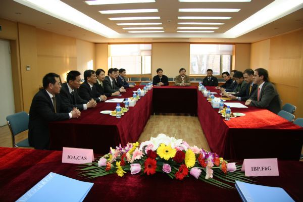 2007年11月29日至12月4日,德国弗劳恩霍夫应用研究促进协会建筑物理研究所(Fraunhofer Institute of Building Physics,Fraunhofer-Gesellschaft)声学研究室负责人Philip Leistner博士及Horst博士、周小儒先生一行,来声学所进行了访问和学术交流,并代表建筑物理研究所(IBP)与声学所签订了合作协议。