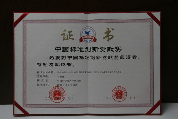 由全国声学标准化技术委员会组织制定和归口管理的国家标准GB/T 19890—2005《声学高强度聚焦超声(HIFU)声功率和声场特性的测量》荣获国家质量监督检验检疫总局和国家标准化管理委员会颁发的2007年中国标准创新贡献一等奖。该标准由上海交通大学、中国科学院声学研究所等单位共同起草,中国科学院声学研究所朱厚卿研究员、牛凤歧研究员作为该标准的主要起草人也分别荣获一等奖。
