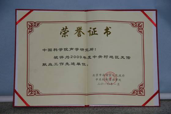 近日,中关村街道对在2009年度无偿献血工作中表现突出的个人和集体进行了集中表彰,声学所荣获“无偿献血先进单位”荣誉称号。