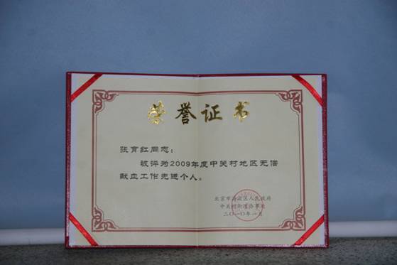 近日,中关村街道对在2009年度无偿献血工作中表现突出的个人和集体进行了集中表彰,声学所张育红同志表现突出,荣获“无偿献血先进个人”荣誉称号。