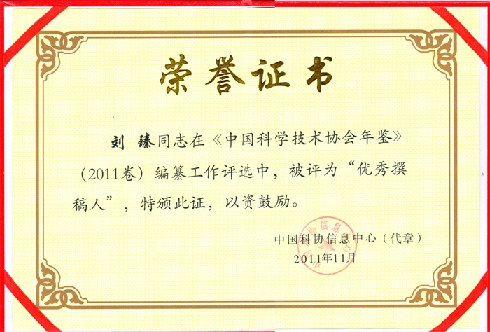 2011年《中国科学技术协会年鉴》编纂业务培训暨工作研讨会于11月23日至26日在海南三亚召开。会上宣布了2011年中国科协所属198个学会年鉴工作的评选结果,在年鉴编纂工作中有19个学会被评为优秀,中国声学学会是其中之一。中国声学学会办公室副主任刘臻被评为优秀撰稿人。