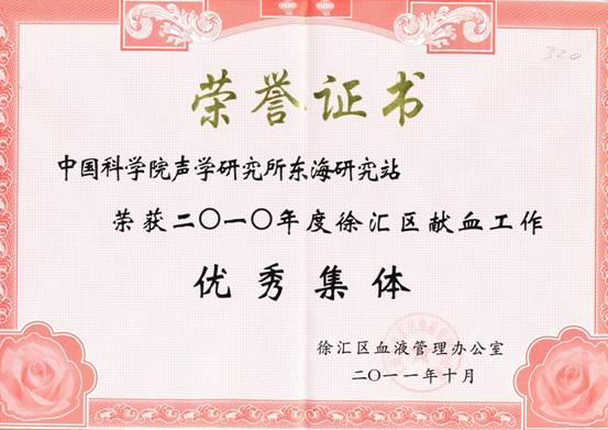 近日,上海市徐汇区血液管理办公室传来喜讯,中科院声学所东海研究站获得“2010年度徐汇区献血工作优秀集体”荣誉称号。该荣誉是对我站近年来的献血工作成绩认可,也是对我站职工、研究生积极弘扬无私奉献精神的鼓励。