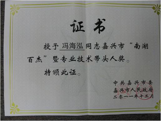 在2011“星耀南湖”精英峰会暨“南湖百杰”优秀人才表彰大会,冯海泓主任被授予“嘉兴市专业技术带头人奖”;