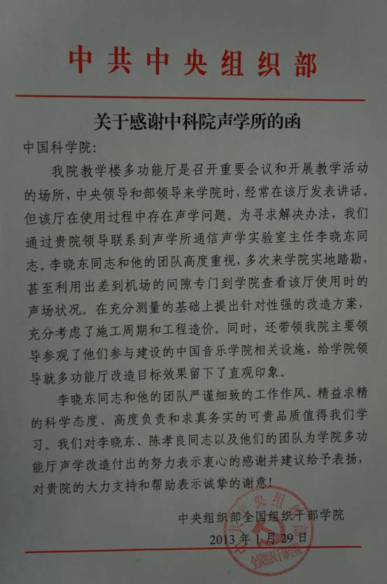 2013年1月29日,中国组织部全国组织干部学院给我所发来感谢信,感谢我所李晓东、陈孝良同志和他们的团队为学校多功能厅声学改造付出的努力,感谢他们严谨细致的工作作风、精益求精的科学态度、高度负责和求真务实的可贵品质。