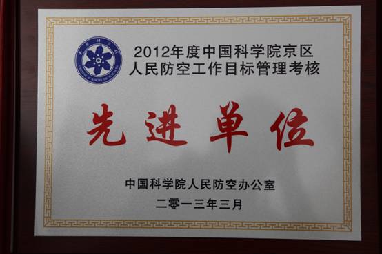 2012年中国科学院人民防空办公室组织京区单位开展人防工作目标管理考核。通过京区各院所单位自查和自测,经人防协作片检查和推荐,院人防办复查和公示,并报院人防委员会会议审议通过,2013年3月4日授予声学所“2012年中国科学院京区人防工作目标管理考核先进单位”荣誉称号。