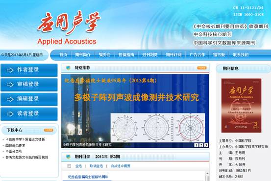 由中国科学院主管、中国科学院声学研究所主办、中国声学学会和《应用声学》编委会编辑、并由科学出版社出版的科技期刊《应用声学》,经过3个多月从传统纸媒向数字化出版网络化传播转型试验期,其网络平台现已全面启用,并正在努力提升自身信息传播能力。网络平台的推出得到了广泛的关注和欢迎,短短3个多月,网站访问量已超过22万人次!网络平台的全面启用,标志着《应用声学》进入了网络化、数字化发展的新阶段。欢迎大家访问《应用声学》网络平台网页:http://yysx.cnjournals.cn。
