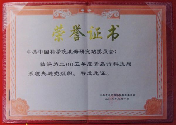 根据青岛市科技局《青科党委字(2006)3号》文件决定,中共北海站党委被评为2005年度青岛市科技局系统先进党组织。中共北海站行政党支部被评为2005年度青岛市科技局先进党支部。