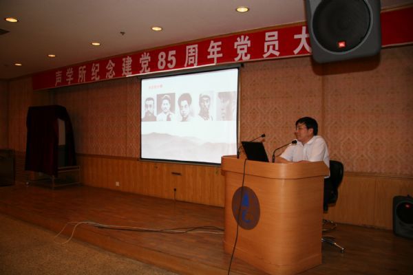 大会在雄壮的义勇军进行曲中拉开帷幕。党委副书记王小民同志受所党委的委托,在会上作了题为“牢记科技工作者的历史使命,为党的事业增光添彩”的主题报告。王小民副书记在报告中通过大量的史实和图片,回顾了中国共产党成立85周年走过的辉煌岁月,总结了党的指导思想的发展历程,讴歌了党带领全国人民在社会主义革命和建设中取得的历史功绩,指出了党在新时期面临的历史任务及科技工作者面临的历史使命。王小民副书记在讲话中希望所内广大党员,牢记党的宗旨,牢记科技工作者的历史使命,牢记声学所的组织目标,时时处处以共产党员的标准严格自己,加强学习,不断提高党性修养和业务素质,团结协作,努力拚搏,为科学院和声学所的知识创新三期工程作出更大的贡献。