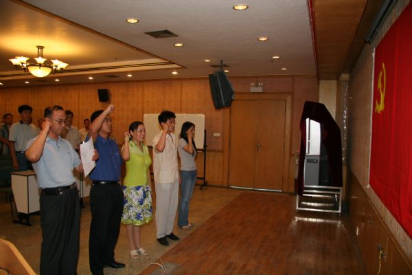 在庄严的党旗下,党委委员孙长瑜同志带领任小燕等四名新近加入党组织的同志进行了庄严的宣誓。张云鹏同志作为新党员代表在会上作了发言。