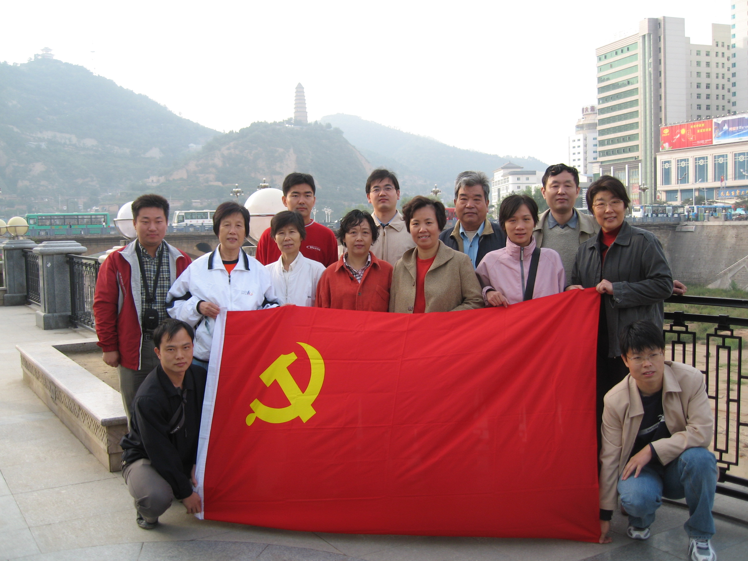 代表们在延水河边宝塔山下合影留念