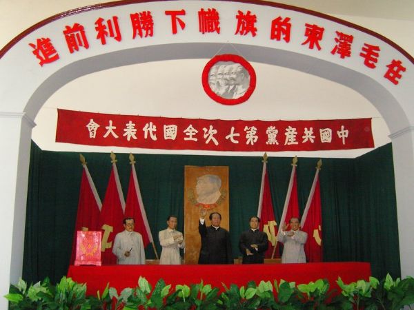 中央大礼堂,可算是杨家岭最辉煌的建筑了,外形酷似一架平伸双翼的大飞机,在暮色里好象停留在硝烟弥漫的过去,字还是那几个字,那个斧头镰刀的图案在暗淡下来的背景下闪耀着红色的微光。走进去,会标是中国共产党第七次全国代表大会,马克思、列宁和毛泽东在 1945 年微笑着,礼堂内的木质的座椅没有尘埃,似乎那些开会的人们才刚刚离去。党的“七大”和 “延安文艺座谈会”等许多重大会议都在这不大的礼堂里召开。就是这些破旧的长条木椅上,坐过当年战场归来的将军们,大家拍拍征尘,点燃烟斗,和台上的领袖们一起讨论中国革命的重大决策。也就在这里确定了马列主义毛泽东思想是中国革命的理论基础,指导思想。当年的会标和主席台的摆设依然如故,照片上,丁玲、贺敬之等作家和文艺战士围着主席开心的笑着,电影演员于蓝的大秧歌“兄妹开荒”在起劲的舞着……