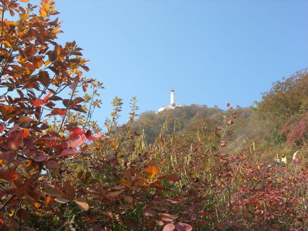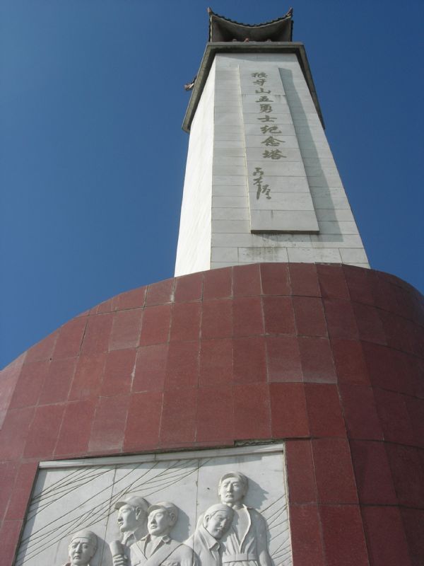 在纪念塔内,还有数级钢梯直通塔顶,DSP支部的几个年轻党员竞相登攀,上到了塔顶的凉亭,放眼望去,千峰竞秀,浮云缭绕,红叶丛丛,狼牙山雄姿尽收眼底。一阵山风拂来,恍惚间似听到当年的枪炮声和呐喊声,听到勇士们跳崖时的高喊:“共产党万岁!乡亲们,永别了!————”