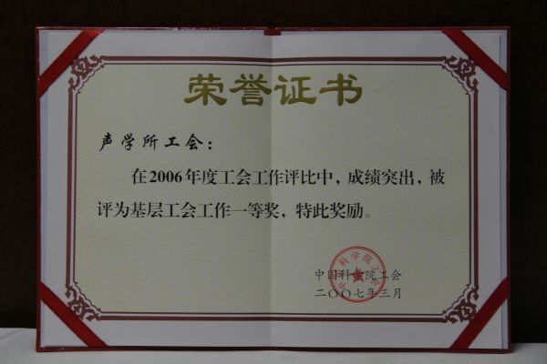 近日,声学所收到中科院工会颁发的荣誉证书,声学所工会在2006年度工会工作评比中,成绩突出,被评为基层工会工作一等奖。