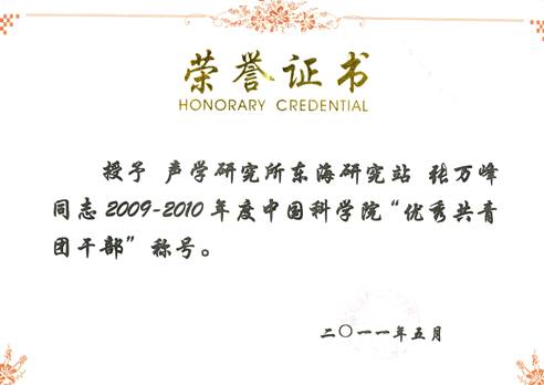 为纪念五四运动92周年,激励广大青年职工、研究生更好的继承和发扬五四精神,积极投身于中科院知识创新工程的伟大实践中,日前共青团中国科学院委员会表彰了一批2009-2010年度院“优秀共青团干部”和“优秀共青团员”。我站青年职工张万峰、赵梅分别获得了院“优秀共青团干部”、“优秀共青团员”荣誉称号。
