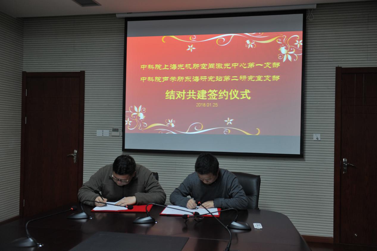 为学习贯彻党的十九大精神,推进“两学一做”教育常态化制度化,中科院声学所东海站第二党支部与中科院上海光机所空间激光中心第一党支部于2018年1月25日进行了结对共建签约仪式。光机所纪委书记吉峻、东海站党委书记张伟才、纪委书记丁培等共同见证了签约。