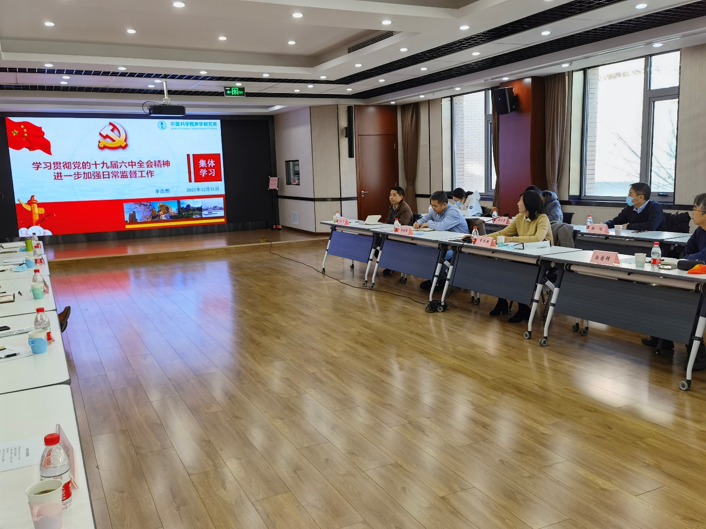 党委副书记、纪委书记李浩然主持会议,带领学习党的十九届六中全会精神,重点围绕《中共中央关于党的百年奋斗重大成就和历史经验的决议》几个关键词带领大家开展学习。按照所纪委落实党史学习教育工作安排,纪委委员白国锋、张莉、林伟军、彭朝晖分别交流了党史学习心得。会议还集体学习了《中国科学院党的建设工作领导小组办公室关于进一步加强日常监督工作的意见》,传达了中科院警示教育会议精神,通报了违反中央八项规定精神典型案例,开展了节日廉洁提醒。