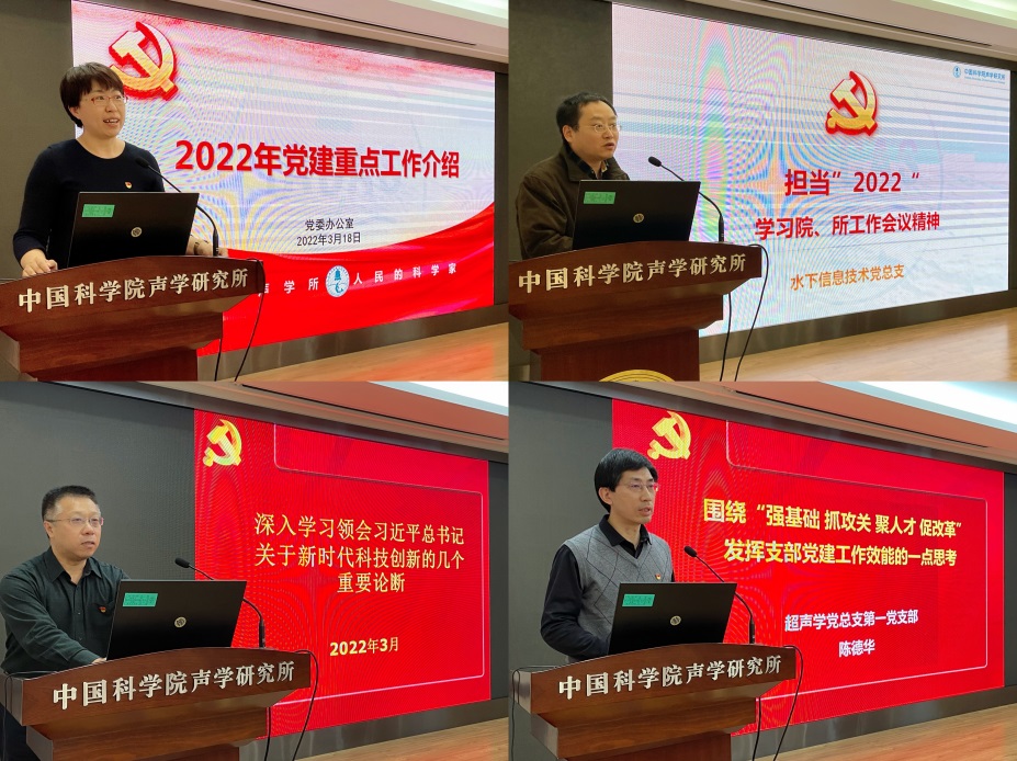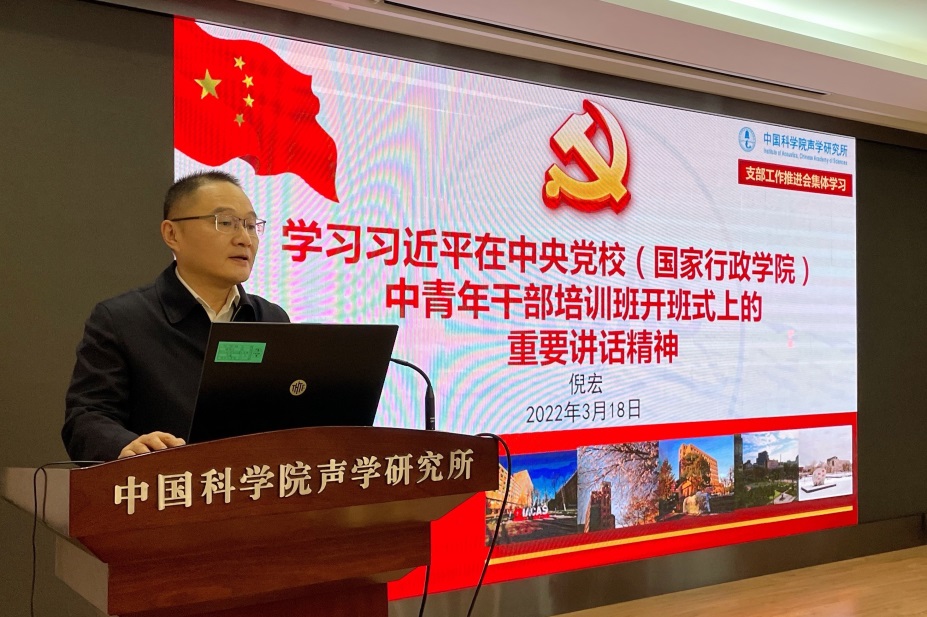 会上,倪宏带领大家集体学习习近平总书记在中央党校(国家行政学院)中青年干部培训班开班式上的重要讲话精神,就“筑牢理想信念根基树立践行正确政绩观在新时代新征程上留下无悔的奋斗足迹”分享学习体会,并结合院工作会议精神学习,围绕“聚焦主责主业,狠抓工作落实”,针对今年所工作主题“担当2022”,对九大要点工作进行了动员和部署。他强调,支部工作要把“基层组织建设见成效”落实到党建工作与科技创新的深度融合中,党员同志们要把勇于担当落实到工作态度、履行责任和实际行动中,把今年的各项工作落实好完成好,推动声学所新的蓬勃发展。