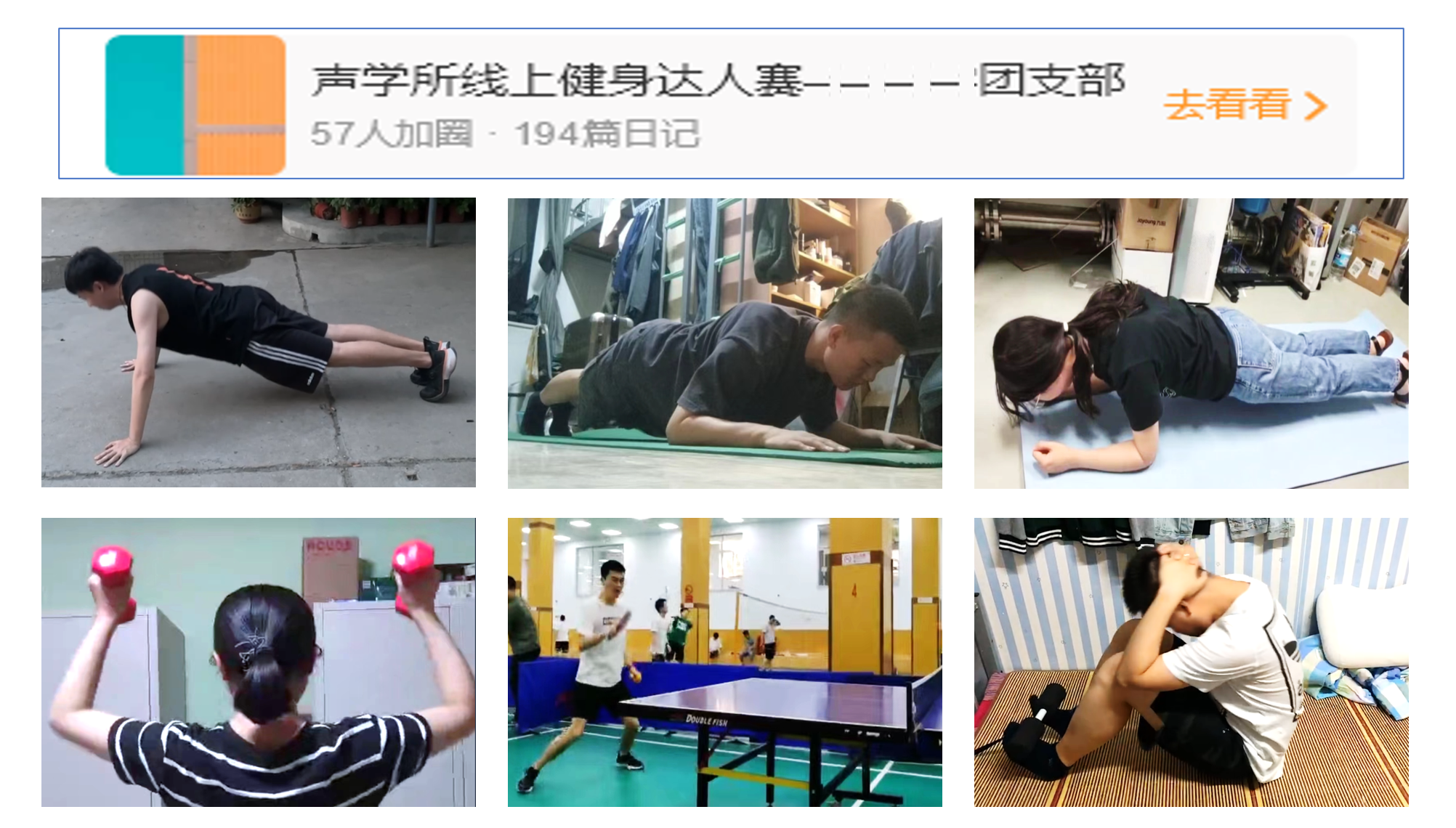 自5月中旬以来,声学所团员青年,尤其是青年学生,积极响应号召,坚持自我隔离,积极为地区疫情防控作贡献。为舒缓团员青年自我隔离期间的心理压力,丰富文化生活,所团委于近期组织开展了“活力校园 运动抗疫”主题线上健身达人赛,全所共200余名团员青年参加了此次活动。