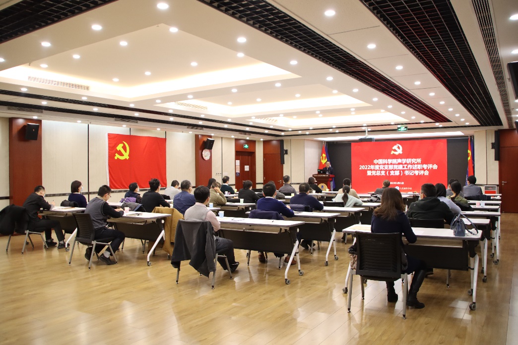 党委书记倪宏作题为《夯实基础抓党建 凝聚合力促发展》声学所2022年度党建工作述职报告,他表示,2022年所党委在上级党组织的坚强领导下,认真学习贯彻落实习近平新时代中国特色社会主义思想和党的二十大精神,落实全面从严治党主体责任工作要求,对标对表党中央及院党组重大决策部署,聚焦声学所工作主题“担当2022”,加强党建科研互融互促,很好地完成全年党建工作的既定目标任务,并从八个方面全面回顾、系统总结了声学所党建工作取得的进展和成效。