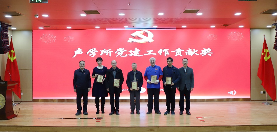 近年来,声学所不断加强基层党组织建设,以高质量党建引领科技创新高质量发展,不断取得突出成绩。今年声学所有四个党支部被评为中央和国家机关“四强”党支部,“四强”党支部数量达到六个。其中,声场声信息党总支第二党支部作为我院唯一代表入选2023年中央和国家机关“四强”党支部建设总论坛并作现场交流;汪德昭深蓝突击队被评为中国科学院优秀科技攻关突击队;院党建工作简讯、科苑党建等多次报道声学所在党建工作方面取得的进展,党建宣传工作在全院排名前列,成效突出,获直属机关党委通报表扬。会议指出,这些成绩的取得离不开全体党务干部的辛勤付出,为表彰他们为声学所党建工作作出的贡献,倪宏代表所党委向不再担任支部书记的彭朝晖、张向军、张运强、鄢社锋、姬培锋、闫玮丽、柳天明、莫福源、裴力伟等同志颁发声学所党建工作贡献奖。倪宏、王雷为获奖代表颁奖。