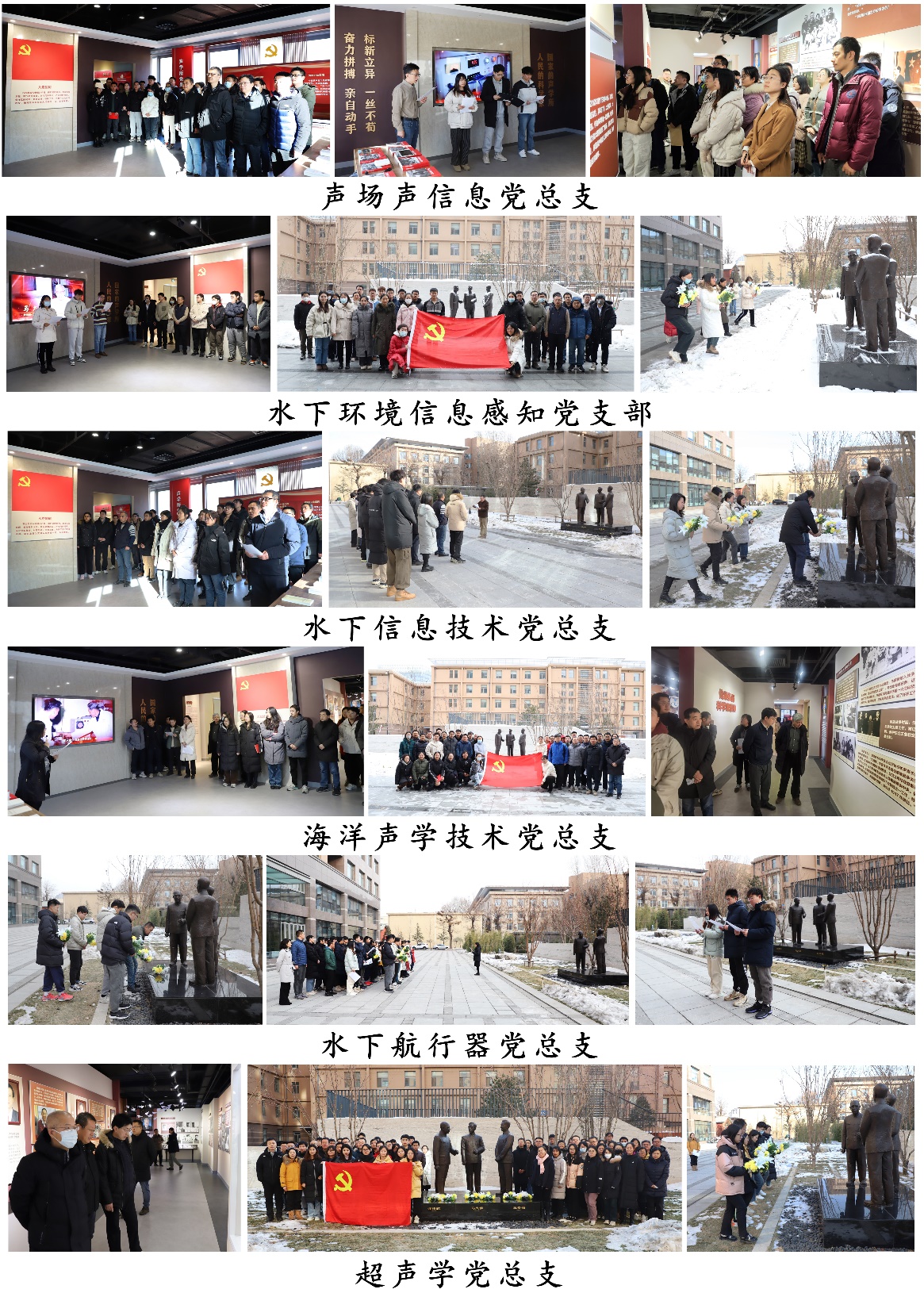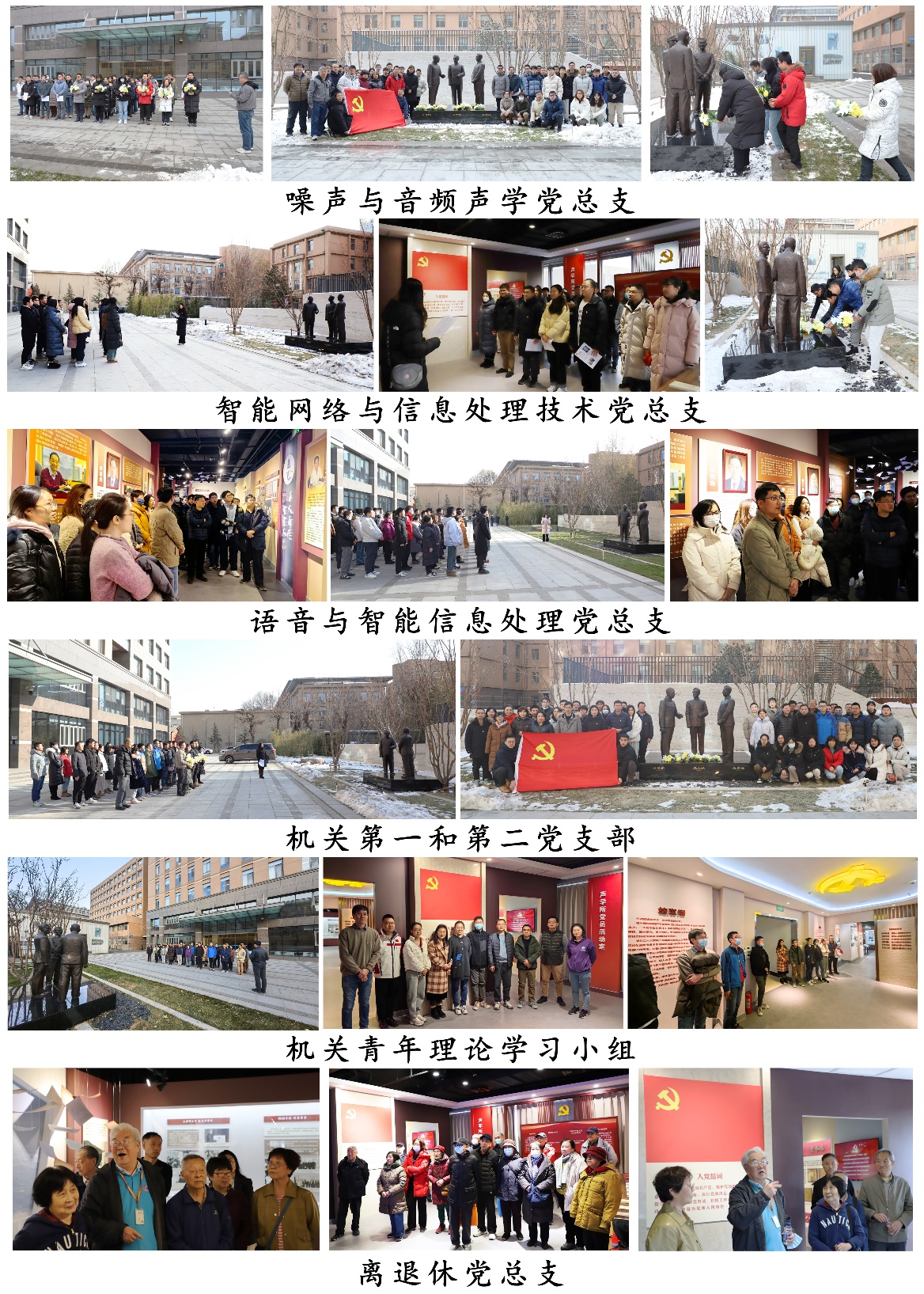 2023年12月,声学所组织开展弘扬科学家精神主题月活动,聚焦抢占科技制高点核心任务,传承弘扬践行科学家精神。全所9个党总支、24个党支部,团结带领600余名党员干部职工、青年学生、离退休老同志,以三会一课、主题党日、青年理论小组等多种形式,组织开展瞻仰院士塑像、诵读科学家经典话语、向老一辈科学家献花、参观科学家精神教育基地等系列主题活动。