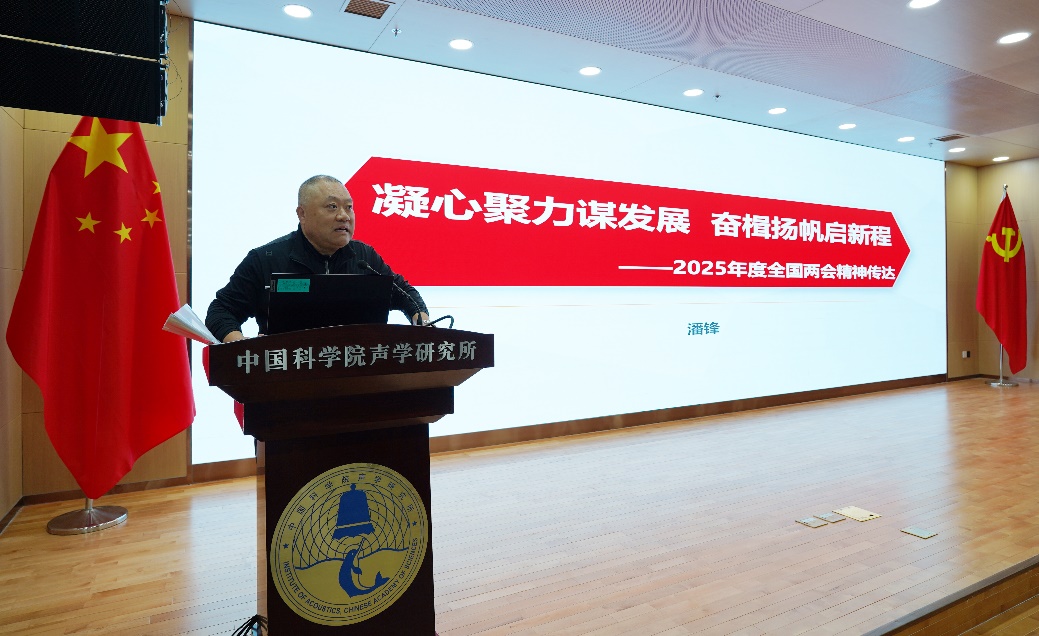 2025年3月24日,声学所党委召开理论学习中心组扩大会,邀请第十四届全国人大代表潘锋作专题报告,传达学习习近平总书记在全国两会期间的重要讲话和全国两会精神,会议专题学习习近平总书记关于党的建设的重要思想。所领导班子成员、党委委员、纪委委员、四级职员、实验室和机关职能部门负责人、相关项目管理机构负责人、党总支和党支部书记、群团组织负责人、青年理论学习小组负责人等50余人参加学习。会议由党委书记库卫群主持。